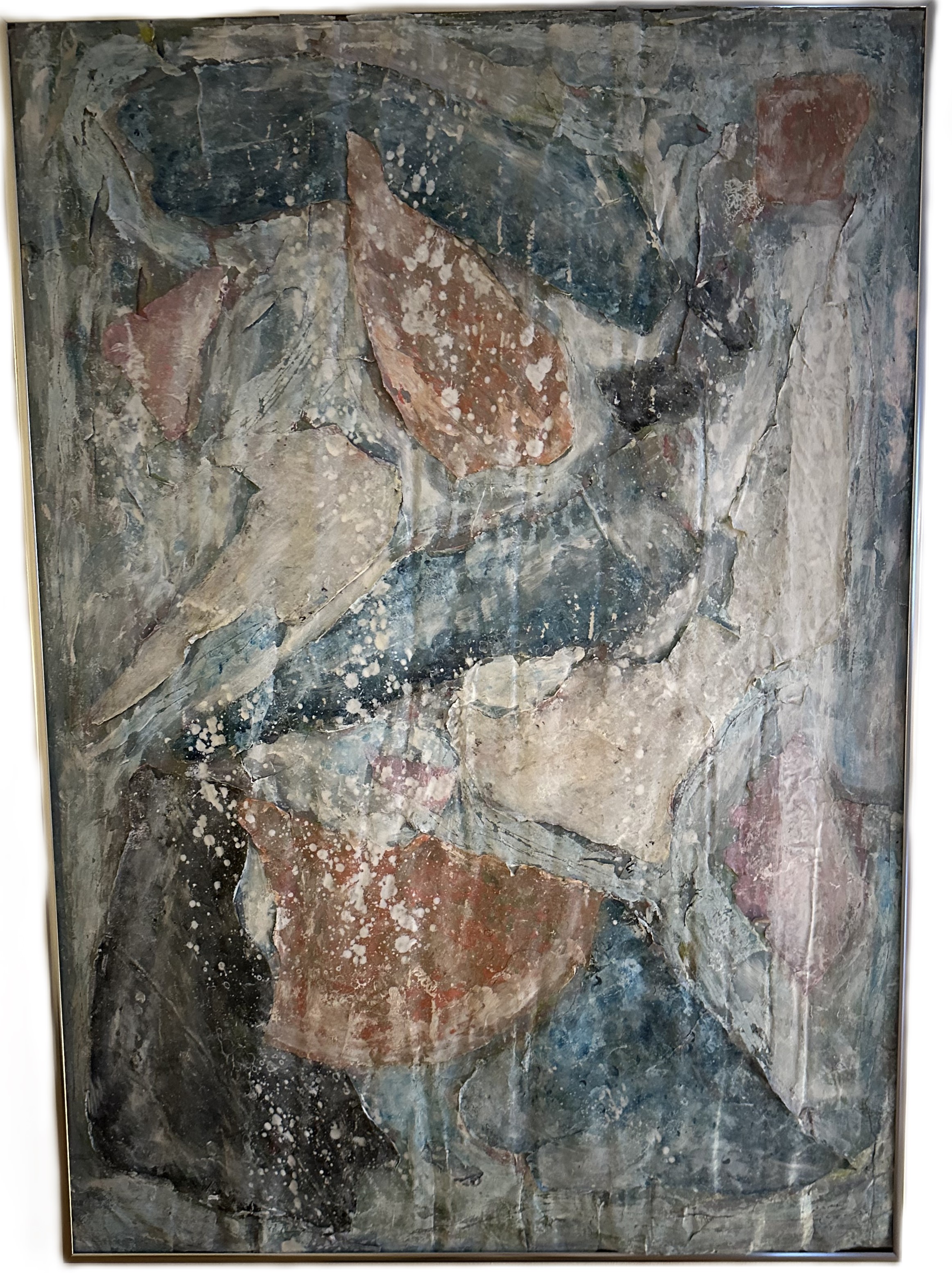 Combination of acrylic paint, organic material and reclaimed objects on canvas with wooden frame
