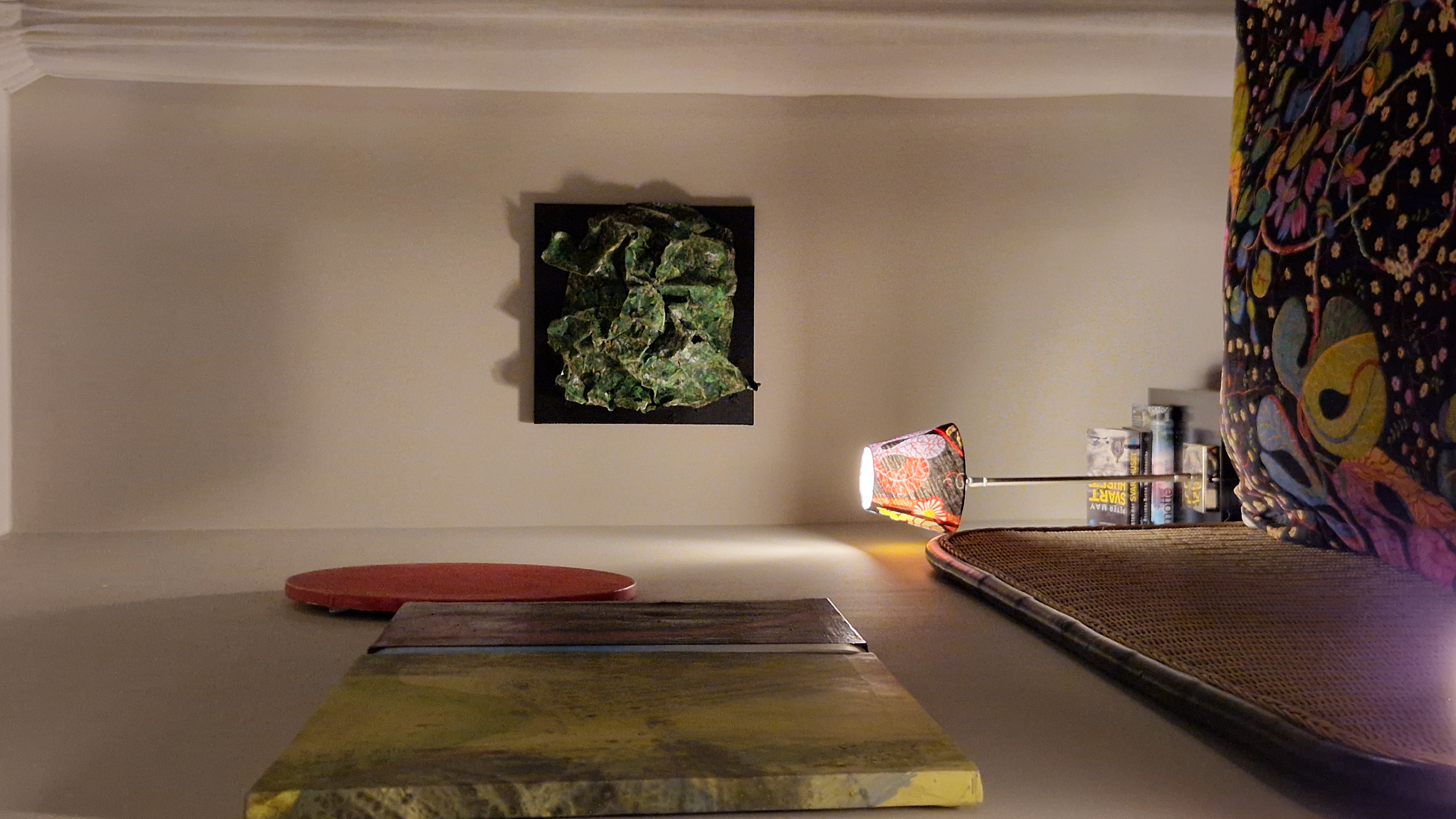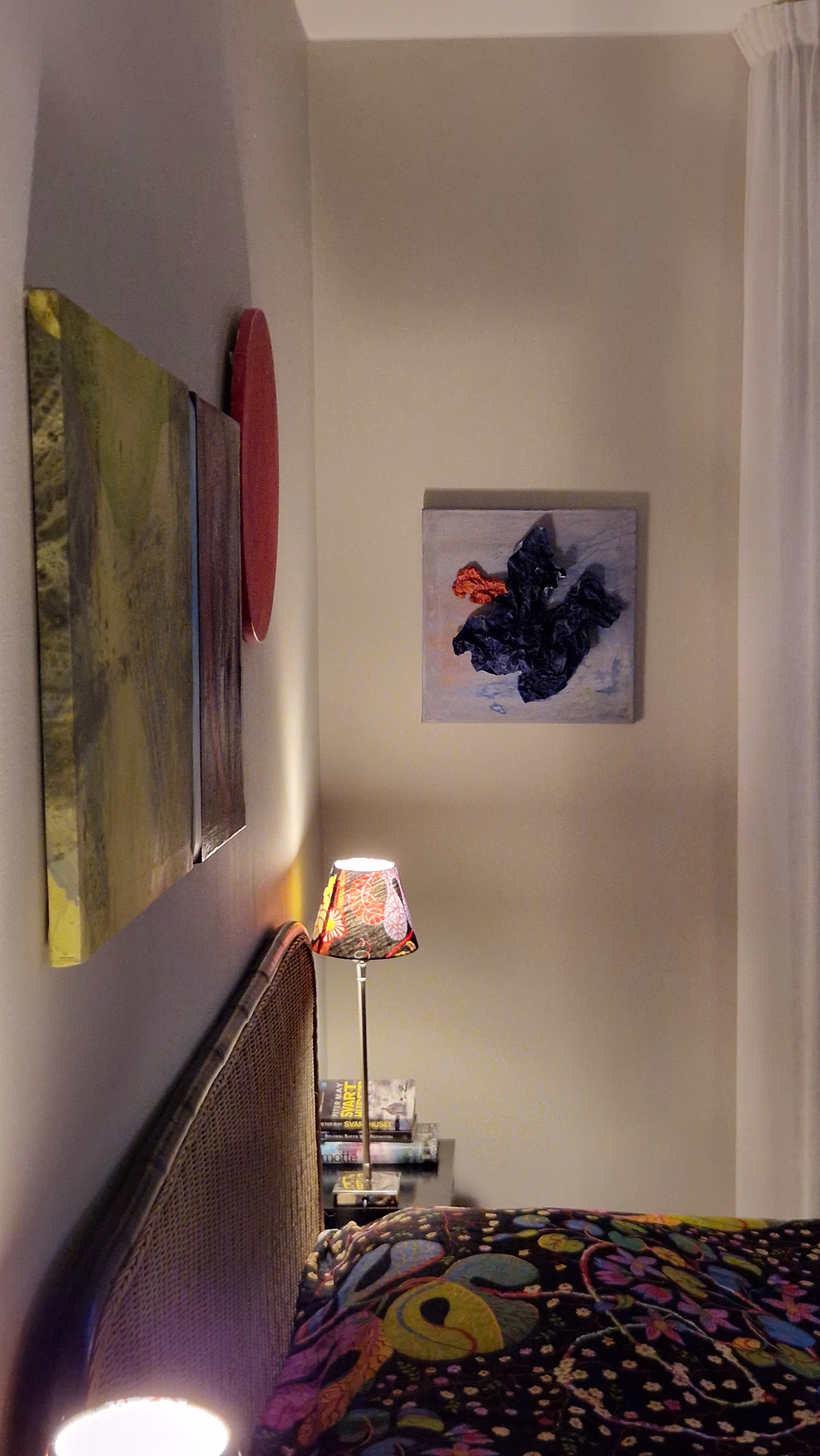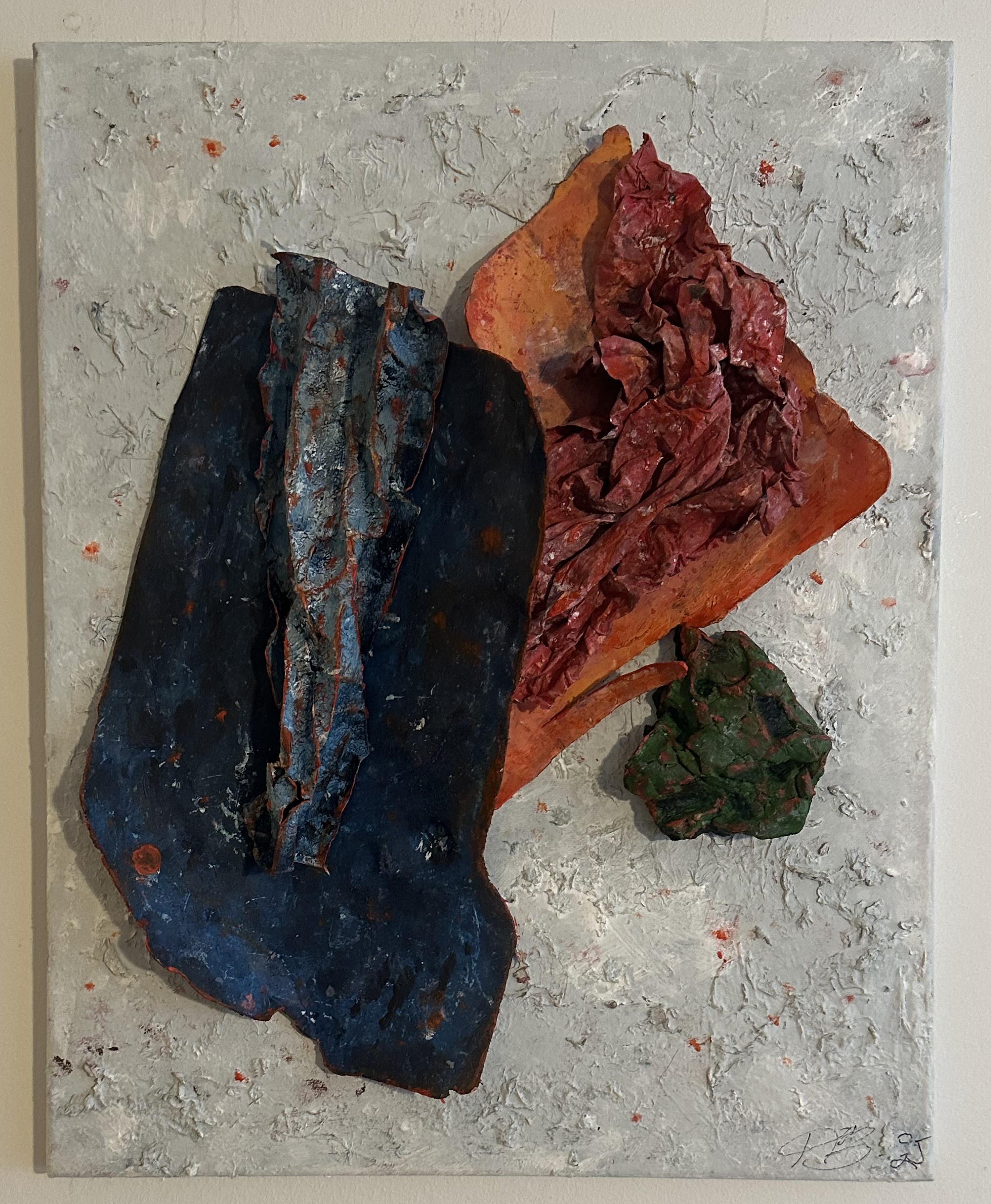 Work on paper with acrylic paint and reclaimed objects on canvas with wooden frame