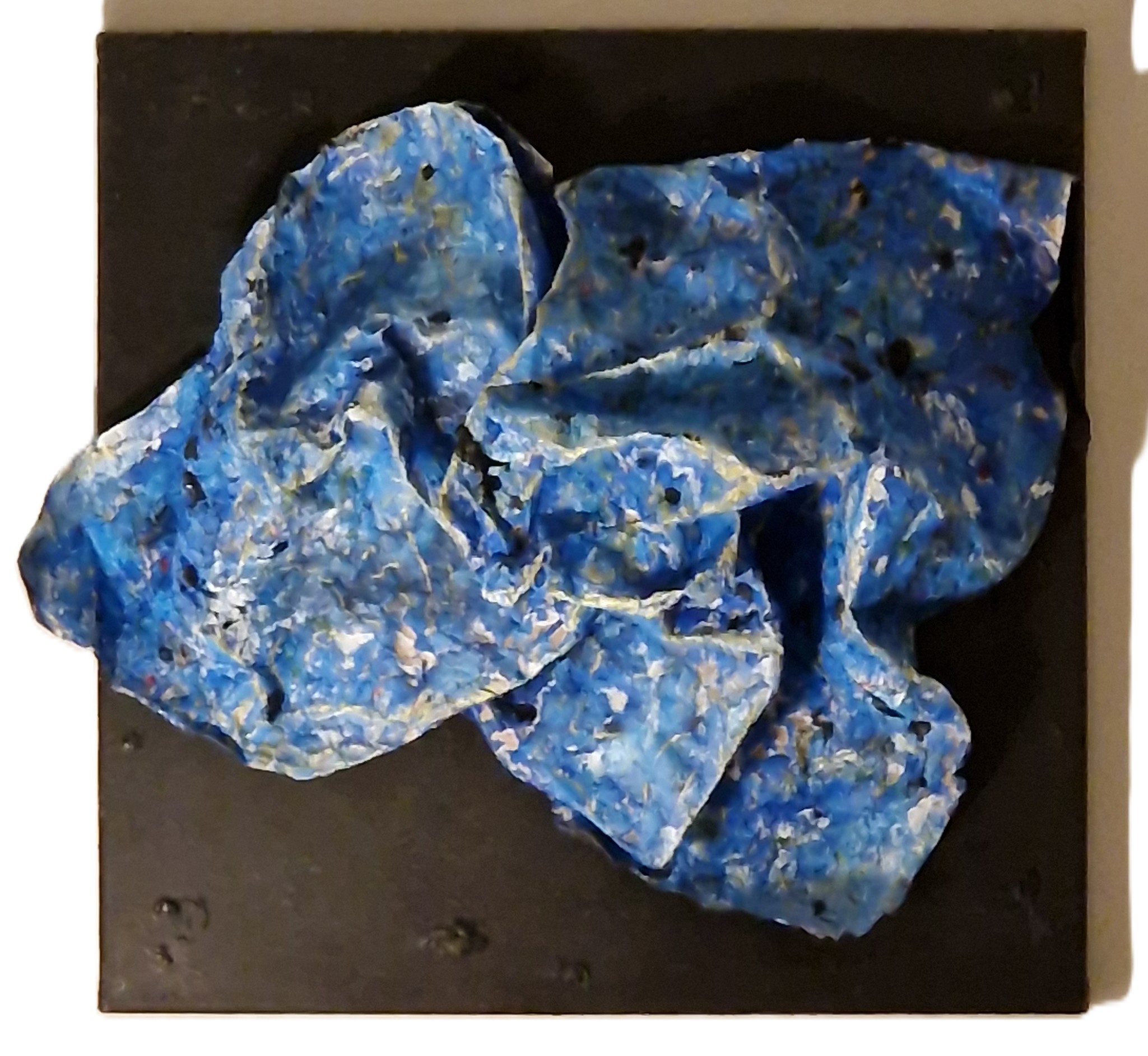 Free-standing sculpture in reclaimed organic objects painted black (acrylic paint) on a marble base.